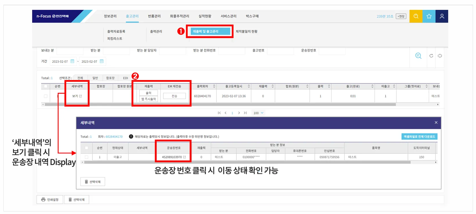 이미 출력 또는 전송된 데이터의 운송장 번호, 받는분 정보 등을 확인하거나