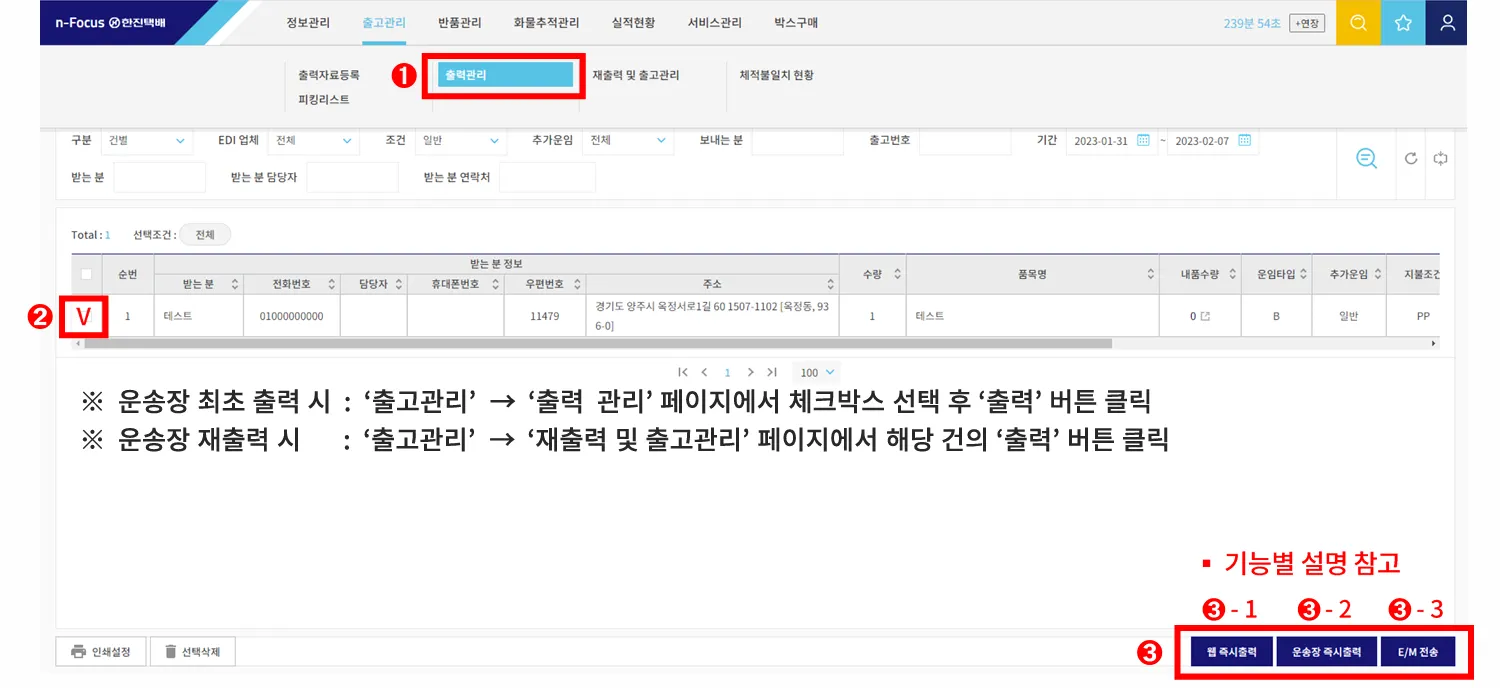 ※ 운송장 재출력 시 : ‘출고관리’ → ‘운송장 재출력 및 출고관리’ 페이지에서