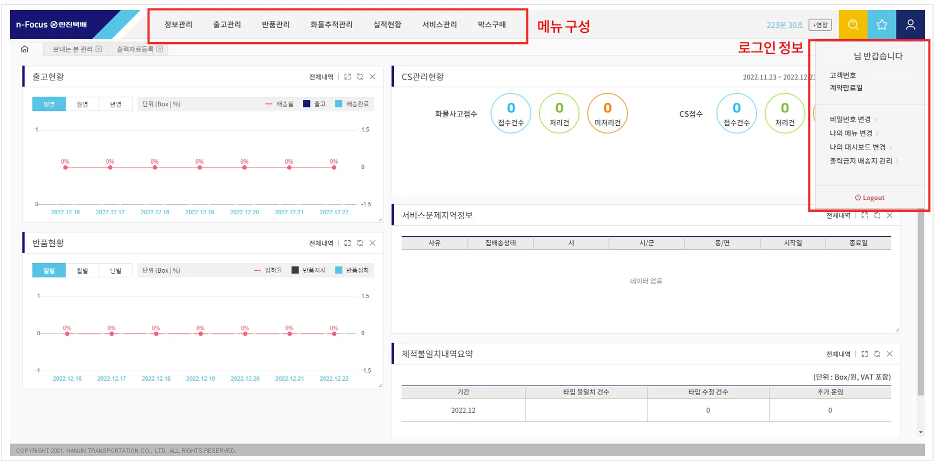 출고현황, 반품현황, CS관리현황 등에 대하여 그래프 및 대시보드 형식으로 확인 가능합니다.