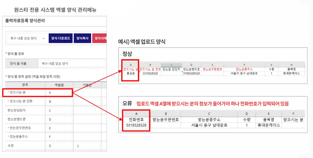 엑셀 파일 업로드 전 설정되어 있는 양식을 꼭 확인해주세요.