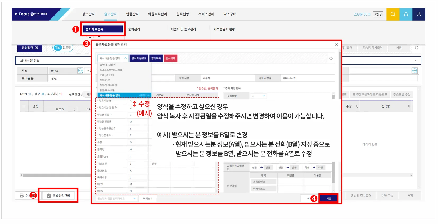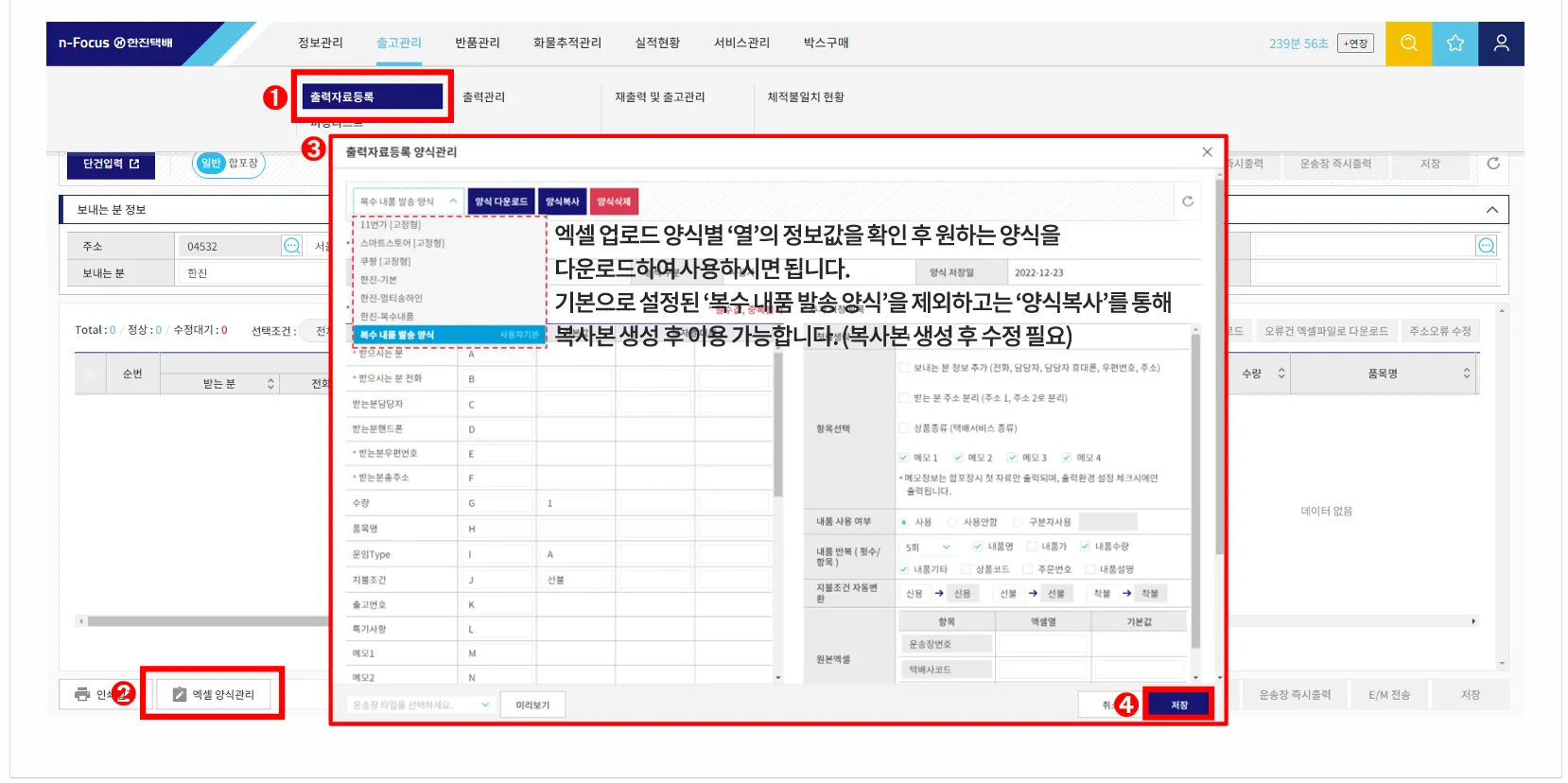 엑셀을 통해 일괄 등록하여 택배를 접수할 경우 출고관리-출력자료등록메뉴에서