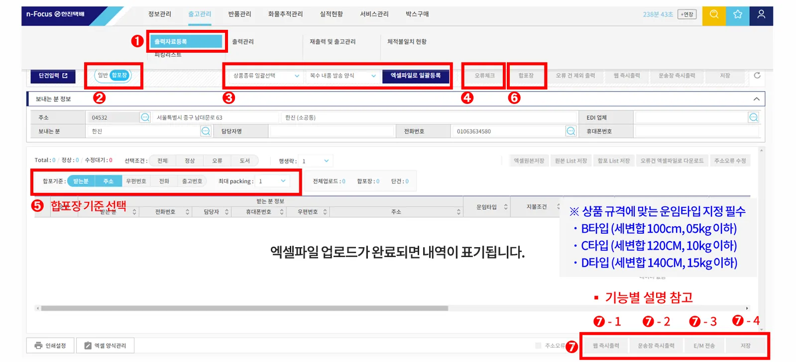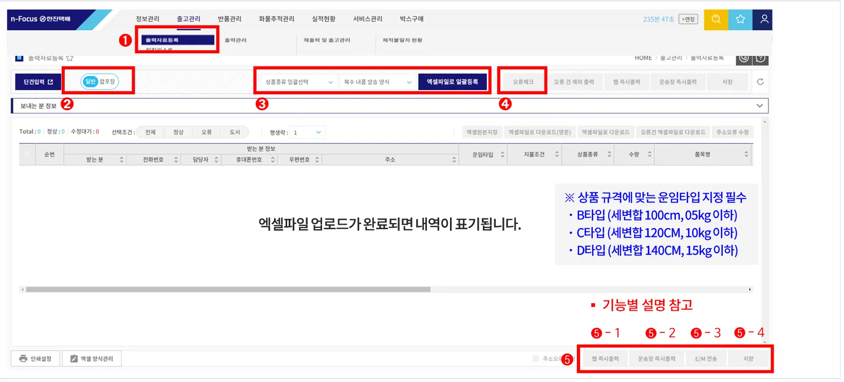 엑셀파일로 일괄 등록 - 업로드 완료 후 오류 체크 - 운송장 즉시 출력 또는 E/M 전송
