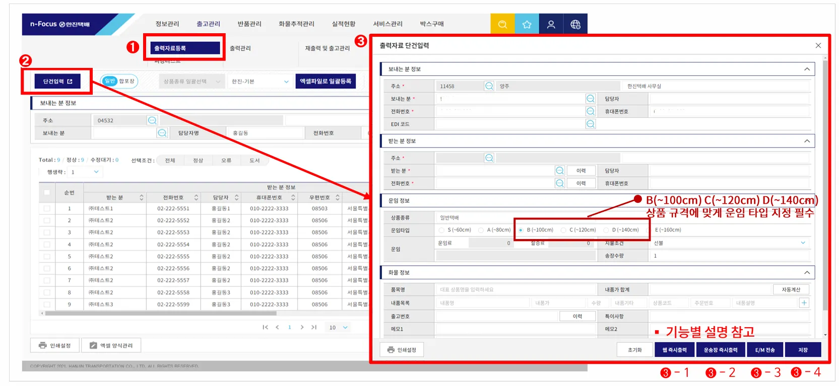 송/수하인 정보 및 운임, 상품 정보 작성 후 운송장 즉시출력 또는 E/M 전송