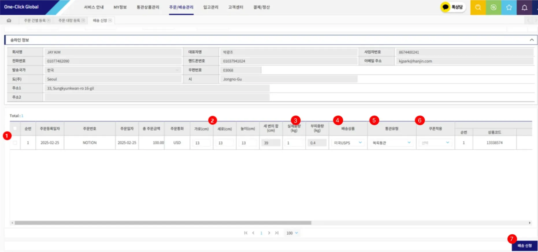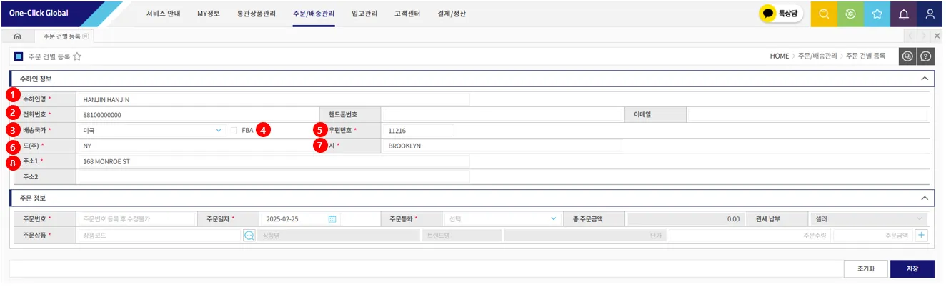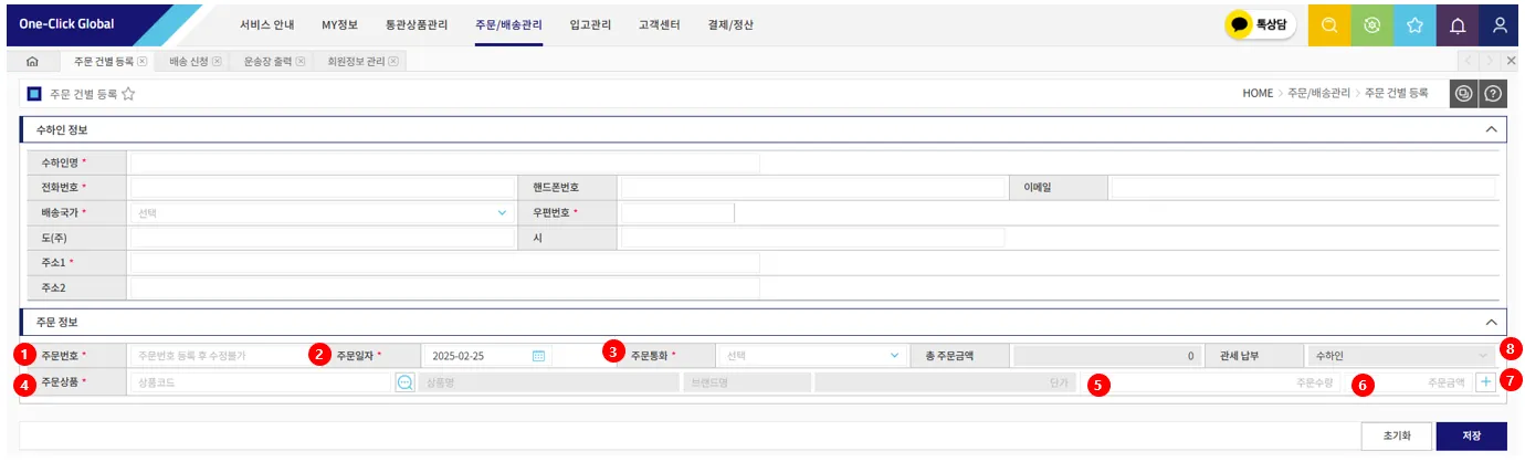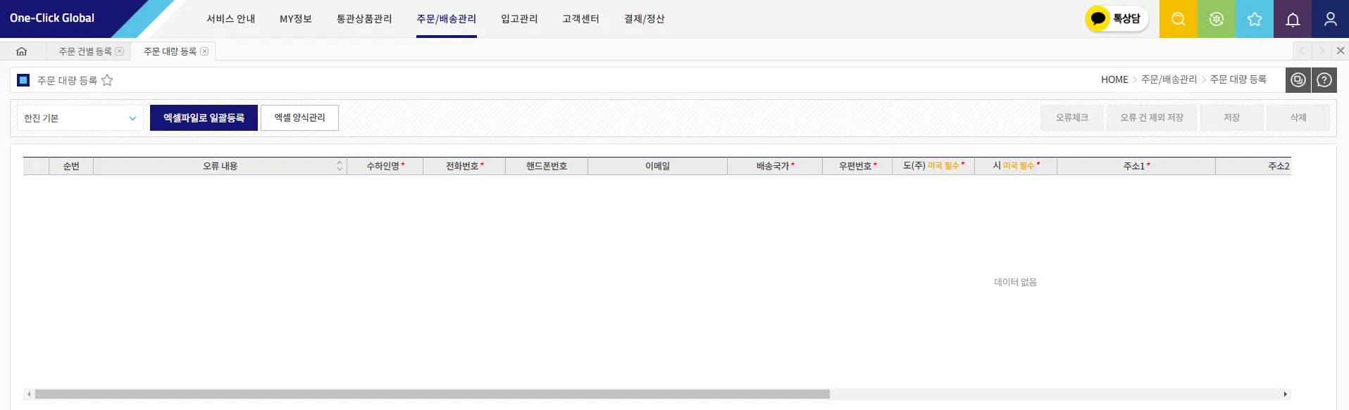 해외 배송 건을 건별로 주문 등록하는 메뉴입니다.